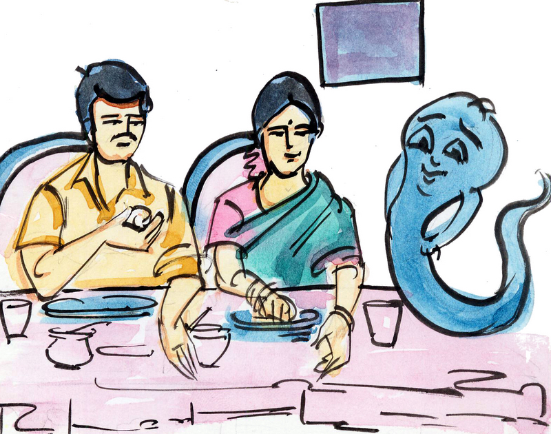 రాత్రంతా కూర్చొని, నీకు నచ్చేట్లు, అత్యంత నాణ్యమైన చీరలు నేసిస్తాం. నువ్వు అవి అమ్ముకుని బాగుపడచ్చు- కానీ గుర్తుంచుకో, ఏ రోజుకారోజు తెల్లవారేలోగా మాకు ఆహారం పెడ్తూ ఉండాలి" అన్నది దెయ్యం, అదృశ్యమౌతూ.