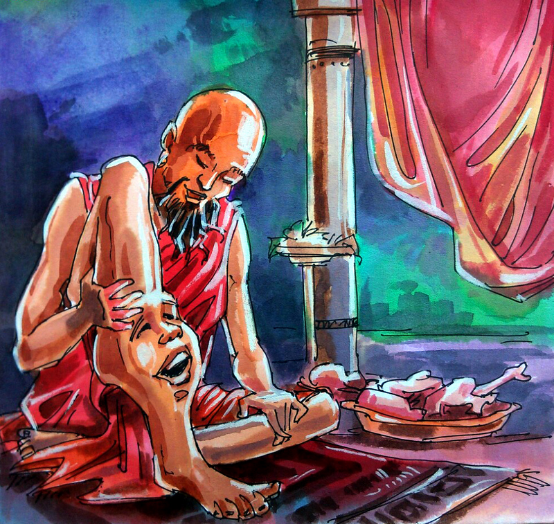 మరుక్షణంలో జాతి గురువు - 'వు - తా' గారి కాలు వాచిపోయింది! ఎర్రగా కమిలినట్లు అయిపోయిన ఆ కాలి పైన ఒక పెద్ద పుండు తయారైంది! మనిషి ముఖం ఆకారంలో ఉన్నదది! ముక్కు, కళ్లు, నోరు, చెవులు! అంతేకాదు; అది 'వు-తా గారితో ప్రత్యేకంగా మాట్లాడటం కూడా మొదలు పెట్టింది - "నువ్వు నా నుండి తప్పించుకున్నాననుకున్నావు కదూ?! కానీ తప్పించుకోలేవు! నిన్ను ఏం చేస్తానో చూడు!" అనటం మొదలుపెట్టింది,