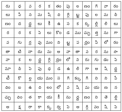 **ఉక్కుమనిషి, పెద్దపేరు, ఉచితం, చింతకాయ, వంతెన, అగ్గిపుల్ల, సముద్రం, సొరంగాలు, కలుషితం, విరుగుడు, పిచ్చుక, కొండముచ్చు, లోగిలి, అనులోమం, మందులచీటీ, చీకటి, చీమలపుట్ట, అట్టముక్క, పెద్దమనిషి, వాతావరణం- ** ఈ పదాలన్నీ క్రింది పట్టికలో దాగున్నాయి- నిలువుగా, అడ్డంగా, వాలుగా, క్రిందినుండి పైకి- ఎటుపడితే అటు! వాటిని వెతికి పట్టుకోండి! వాటి చుట్టూ గుండ్రాలు గీయండి చూద్దాం!