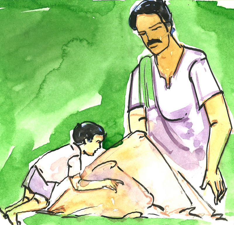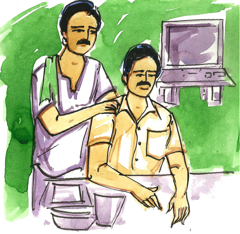 మళ్ళీ ఒకసారి 'భుజం నొప్పి, భుజం నొప్పి' అన్నాడయ్యా. నేను వెళ్ళి భుజాలు నొక్కాను. 'చాలా బాగుందిరా' అని మెచ్చుకున్నాడు. ఇంకోసారి 'నడుము నొప్పి, నడుమునొప్పి!' అని మొత్తుకున్నాడయ్యా. సరేనని నేను నడుము పిసికాను. 'బలే ఉంద'ని మెచ్చుకున్నాడయ్యా.