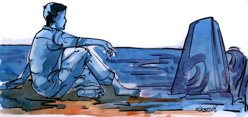 నీటి ప్రవాహంలో రేగిన అలలు ప్రక్కనే ఉన్న తీరాన్ని తాకుతున్నాయి. శక్తి క్షీణించి నశిస్తున్నాయి. చల్లగాలిలో సేదతీరుతూ కొద్దిసేపు ఈ లోకాన్ని మరచిపోయాడతను.