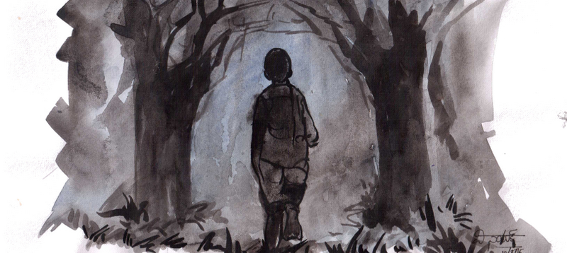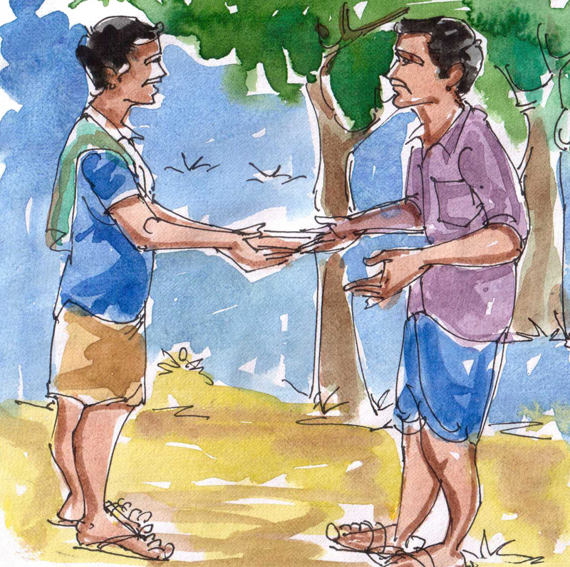 కొద్ది దూరంలోనే అతనికి ఒక దృశ్యం కనబడింది- తుప్పల మాటున నలుగురు మనుష్యులు నిలబడి ఎవరో ఒక బాటసారిని కట్టెలతో బాదుతున్నారు-