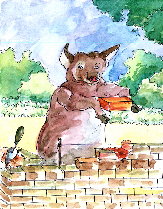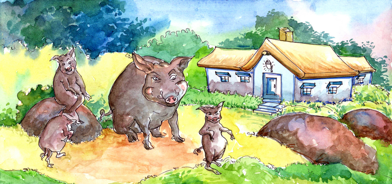 ఒకరోజు ఉదయాన్నే అది పందులున్న ఇంటి దగ్గరకొచ్చి "ఏయ్, మురికి పందులూ, నన్ను లోపలకి రానివ్వండి!" అన్నది.