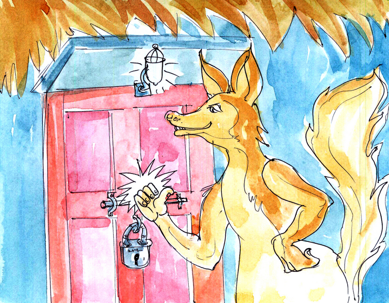 అయినా తోడేలు ఆగలేదు. సుత్తి తీసుకుని తాళం మీద గట్టిగా ఒక్క దెబ్బ వేసింది. అంతే- ఒక్కసారిగా షాక్ కొట్టి ఎగ్గిరి అవతల పడింది.