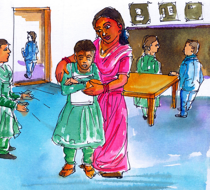 రాణి వాళ్ల క్లాస్ టీచర్ గారు చాలా మంచిది. రాణి నిరుత్సాహంగా ఉండడం చూసి ఆవిడ 'ఏంటమ్మా అలా ఉంటున్నావు?" అని అడగ్గానే ఇంటిలో జరిగేదంతా చెప్పి కళ్ల నీళ్ళు పెట్టుకున్నది రాణి.