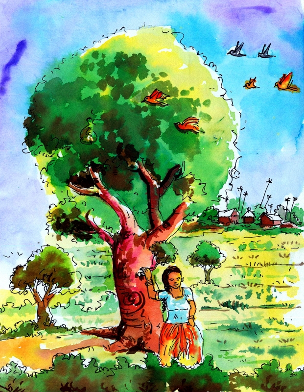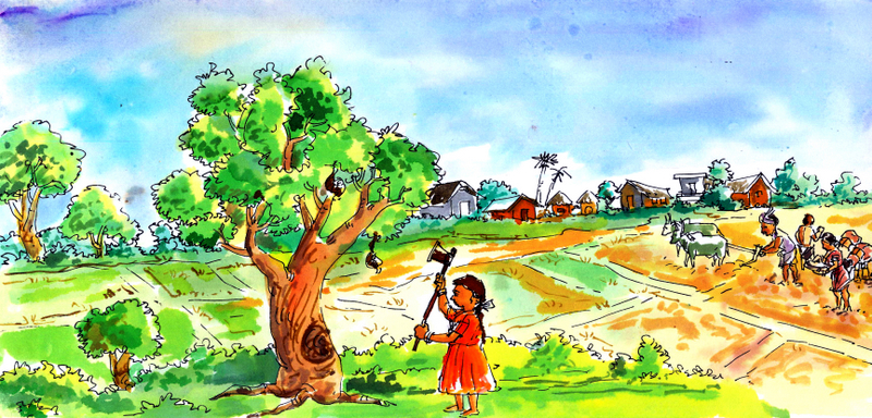 "చెట్టును కొట్టేస్తే ఇంక మీరు ఎక్కడుంటారే?!" అన్నది. వెంటనే చెట్టును కొట్టేసేందుకు పూనుకున్నది. అనుకున్నదే తడవు గొడ్డలికి పని పెట్టింది. అయితే చెట్టు చాలా గట్టిగానే ఉన్నది. కొంచెం సేపు కొట్టాక ఆ పాపకు అలుపు వచ్చింది. అంతలోనే వాళ్ళ అమ్మ వాళ్ళు అక్కడికొచ్చారు. ఈ పాప చేస్తున్న పనిని చూశారు.