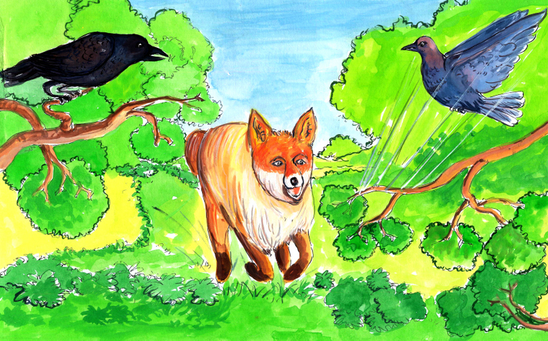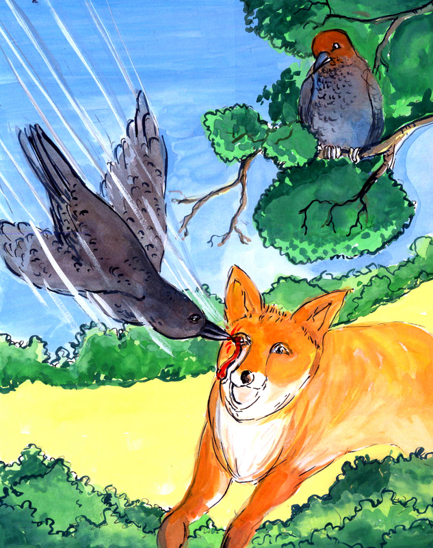 అయితే సరిగ్గా అదే సమయంలో మళ్ళీ పావురాన్ని పట్టుకునేందుకు నిశ్శబ్దంగా చెట్టు ఎక్కుతున్నది నక్క. చిన్నబోయి తల వంచుకున్న పావురపు చూపు నక్క మీద పడింది. "కావ్! కావ్! నక్క వచ్చేసింది! ఎగురు! పారిపో!" అని అది పావురాన్ని ఉద్దేశించి అరిచి, అది పైకి ఎగిరి పోయింది.