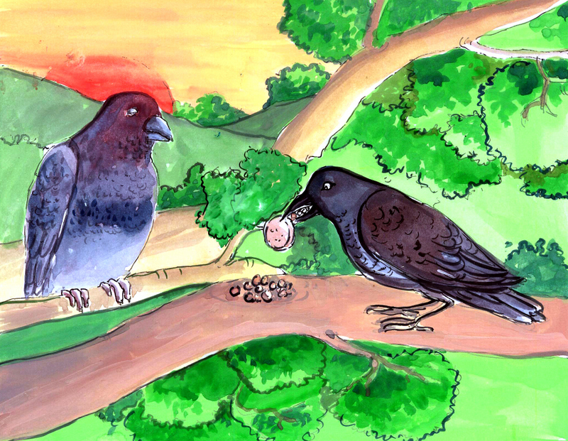 అయితే పావురానికి దాన్ని చూస్తే చికాకు వేసింది. "నీ ఆహారం నాకు అవసరం లేదు. నువ్వు దూరంగా ఉండు" అంది పావురం. ప్రేమగా పలకరించబోయిన కాకి దాని మాటలకు చిన్నబోయింది.