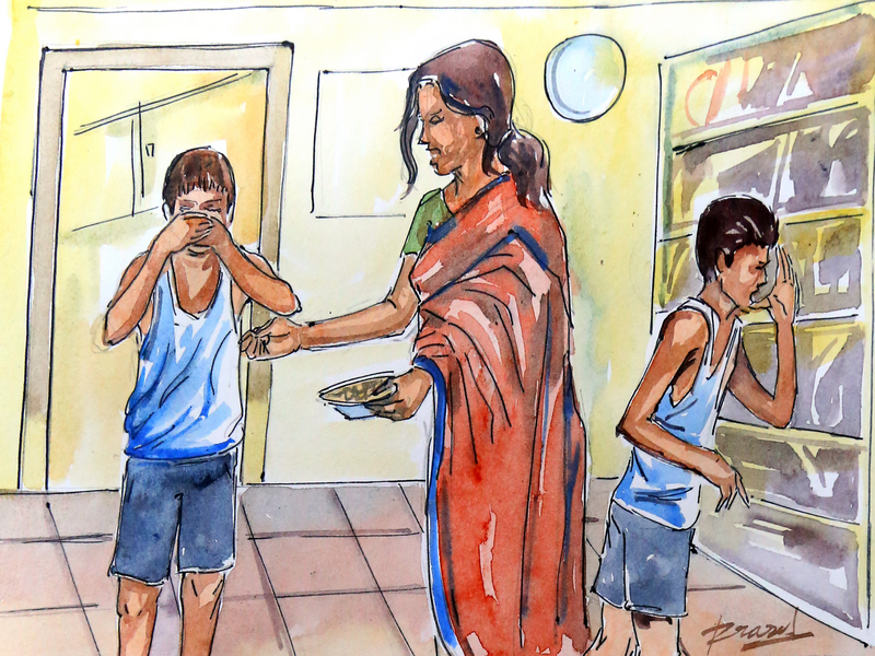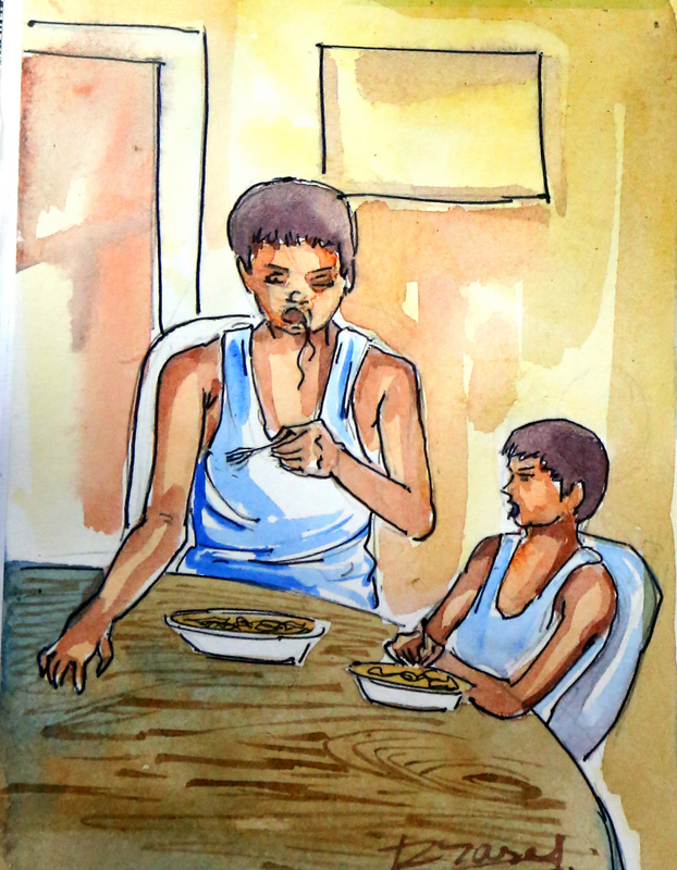 నూడుల్స్ తినేసాక ఇద్దరూ నానమ్మకు చెప్పి ఆడుకోవడానికి వెళ్లిపోయారు. రెండు గంటల తర్వాత ఇంటికి వచ్చి, చకచకా కాళ్ళు చేతులు కడుక్కొని, స్నానాలు చేసారు: అన్నం వడ్డిస్తున్న అమ్మ దగ్గరికి వచ్చారు.