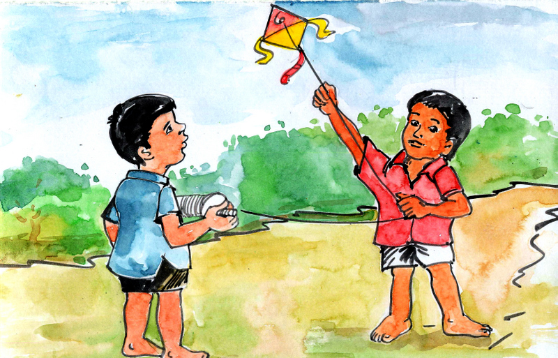 ఒకరోజున రాము-సోములిద్దరూ గాలి పటాలు ఎగరేసేందుకు ఊరి అవతలికి వెళ్లారు. గాలి తగినంతగా ఉంది. రోడ్డంతా ఖాళీగా ఉంది. రాము గాలి పటాన్ని ఎగరేస్తూ వెనక్కి నడుస్తూ ఉంటే సోము దారపు కండెని చేతిలో పట్టుకొని గంతులేస్తున్నాడు.