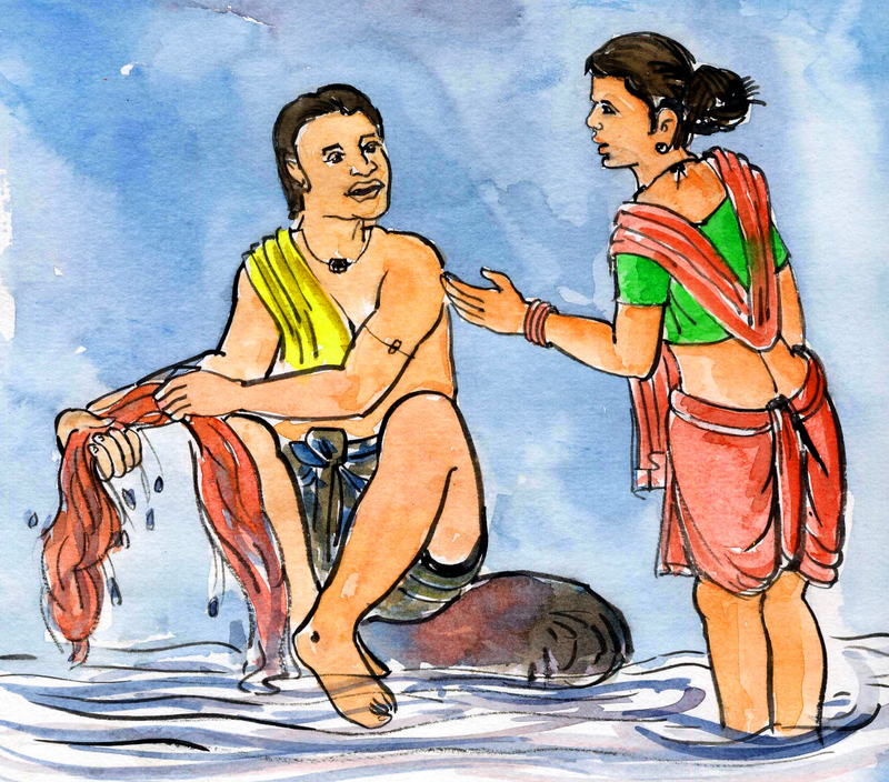 అనుకున్నట్లే ఆ రేవు దగ్గరికి వచ్చాడు సంస్కృత పండితుడు. నదిలోకి దిగి స్నానం చేస్తున్నాడు. చాకలి ఆయన తీరును చూస్తూ తన జోరు పెంచాడు.