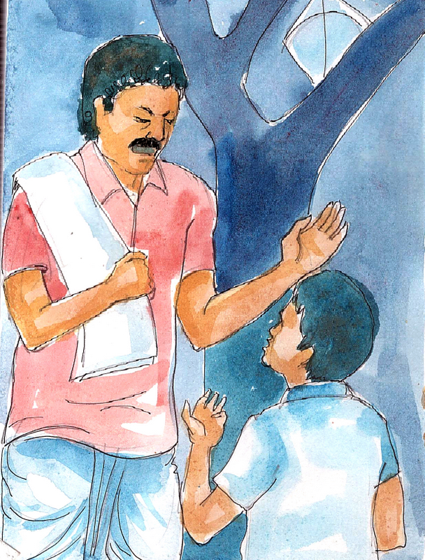 "నియతీ, నువ్వు నీ బంతి కోసం వెతుకుతున్నావు కదూ?! నాకు తెలుసు. నేను దాన్ని చూశాను, తీసుకు వెళ్తున్నాను. నీకు నీ బంతి అంటే చాలా ఇష్టం కదూ?! మరి అంత మంచి బంతి, నీ బంతి నీకు కావాలంటే ఏం చేయాలి? శివుడి గుడికి రా, ఇవాళ్ల రాత్రి పదింటి కల్లా. పది కంటే ముందుగా వస్తే లాభం ఉండదు- ఎందుకంటే తొమ్మిది గంటల సమయంలో అక్కడ చాలా మంది మనుషులు ఉంటారు కదా, అంతమంది మనుషుల్లో నేను ఎవరో నీకు తెలియదు మరి. అందుకని పది గంటలకే రావాలి.