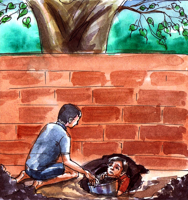 “మట్టి తిన్నె కూలిపోయింది! ఒక వారగా అదంతా విరిగి పడిపోతుండటం కనిపించింది నాకు! దాంతో గభాల్న చివరి క్షణంలో తప్పించుకున్నాను. లేకపోతే సజీవంగా సమాధి అయిపోయి ఉండేవాడిని!" అన్నాడు వాడు రొప్పుతూ.