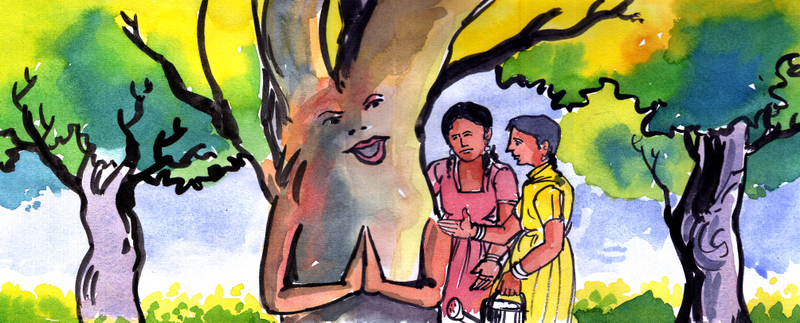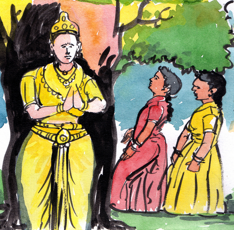 ఆ మహానుభావుడు చల్లబడి, 'తల్లీ! చేసిన పాపం ఊరికే పోదు. ఈ అడవికి ఉత్తరం దిక్కులో ఉన్న ఒక ఎడారిలో 125మొక్కలు నాటితే నీ స్వామికి విమోచనం అవుతుంది. ఐతే ఆ పని నువ్వు చేయలేవు- ఎవరైనా మానవులు, మీ మీద ప్రేమతో ఆపని చేసి పెట్టినప్పుడే నీ భర్తకు విముక్తి" అని సెలవిచ్చాడు'" చెబుతుంటే దేవత కళ్ళలో నీళ్ళు సుడులు తిరిగాయి. "నువ్వేమీ బాధ పడకమ్మా! మేం నీకు సాయం చేస్తాం. మేం వెళ్ళి ఆ మొక్కలు నాటుతాంగా, ఈ వారంలోనే!" అని ఆమెకు ధైర్యం చెప్పారు.