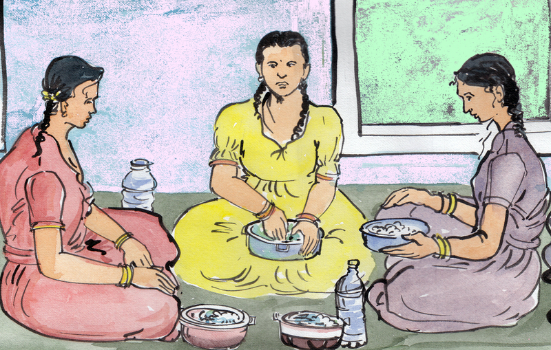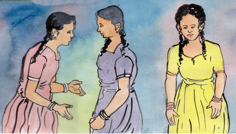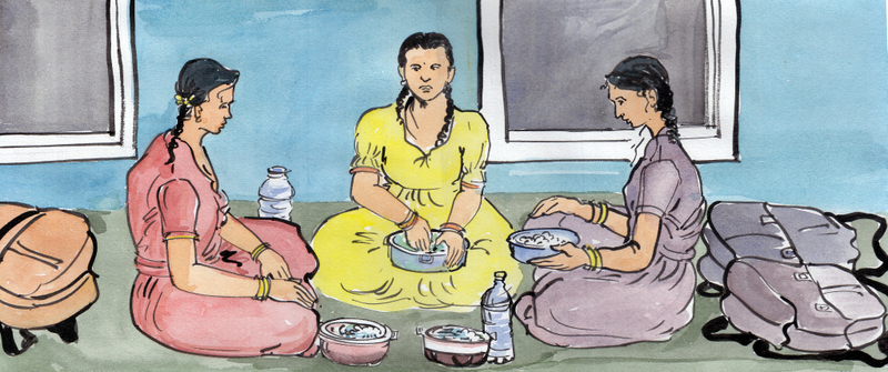 చూస్తూన్న కావ్య నాలుక కరచుకున్నది గానీ, వాళ్ల పట్ల ద్వేషభావం మటుకు ఆమెలో ఏమాత్రం తగ్గలేదు. ఒక రోజు తెల్లవారుజామున్నే కావ్య వాళ్ళ అమ్మానాన్నలు అకస్మాత్తుగా ఊరికి పోవలసి వచ్చింది. దాంతో కావ్య ఏమీ తినకుండానే బడికి వచ్చింది: "బడిలో ఎట్లాగూ మధ్యాహ్న భోజనం ఉంటుంది కదా!” అనుకున్నది ఆ పాప.