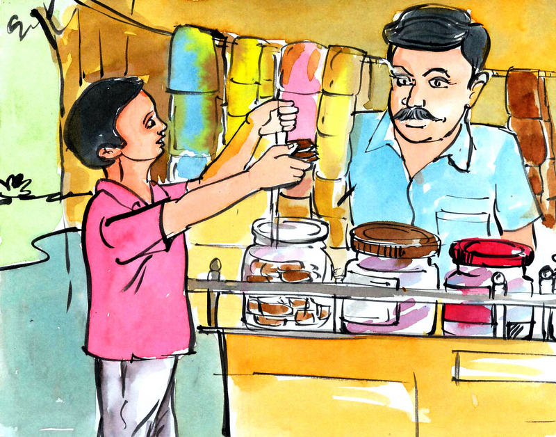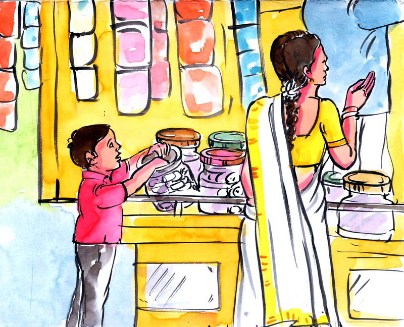 రాజు, వాళ్లమ్మ ఒక రోజున దుకాణానికి వెళ్లారు.