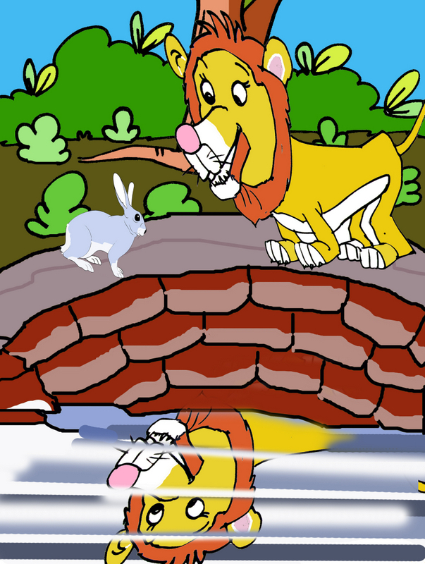 బావి లోకి చూసిన సింహానికి తన ప్రతిబింబమే కనిపించింది. "ఆగు! ఇప్పుడు నిన్ను చంపేస్తాను!” అని అది ఆవేశంతో బావిలోకి దూకింది. వెంటనే జంతువులన్నీ పైనుండి రాళ్ళు రప్పలూ విసిరి బావిలోనే దాన్ని తుదముట్టించాయి. జంతువులకు మోసకారి పీడ వదిలిపోయింది.