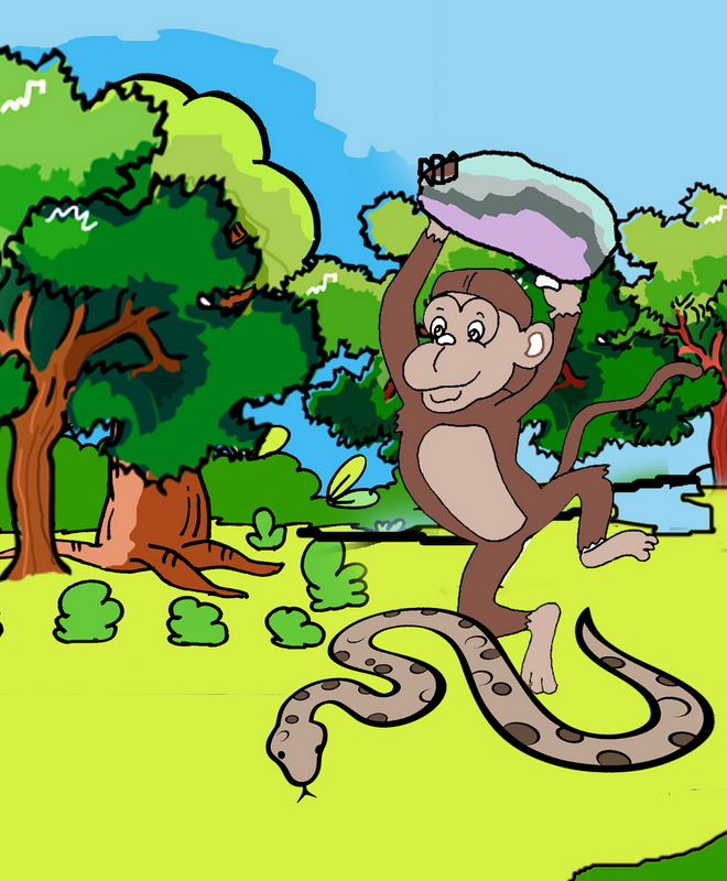 “సింహం నన్ను బెదిరిస్తోంది. 'చెప్పినమాట వినకపోతే అంతే' అంటోంది!” ఫిర్యాదు చేసింది పాము. కోతికి కోపం వచ్చింది. "అట్లా ఎట్లా అంటుంది? వీల్లేదు. నువ్వు నా చెట్టు క్రింద ఉండు. నీకేమీ కాకుండా నేను చూస్తాను" అన్నది.