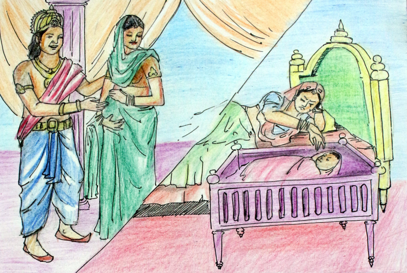 ఆ సమయానికి విజయసింహుడు నగరంలో లేడు. అతను వచ్చి చూసేసరికి పిల్లవాడు పురిట్లోనే కన్ను మూశాడన్న వార్త అందింది. పుత్ర సంతానం మీద విపరీతమైన అభిమానాన్ని పెంచుకున్న రాజు తీవ్ర నిరాశకు గురయ్యాడు. మనస్తాపంతో అనారోగ్యం పాలై త్వరలోనే కాలం చేశాడు .