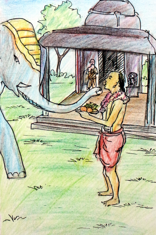 దేవాలయం ముందు నుంచుని ఉన్నాడు మావటి కుమారుడు. ఏనుగు ఒక్కొక్క అడుగూ ముందుకు వేస్తూ ఆ కుర్రవాడిని సమీపించింది.