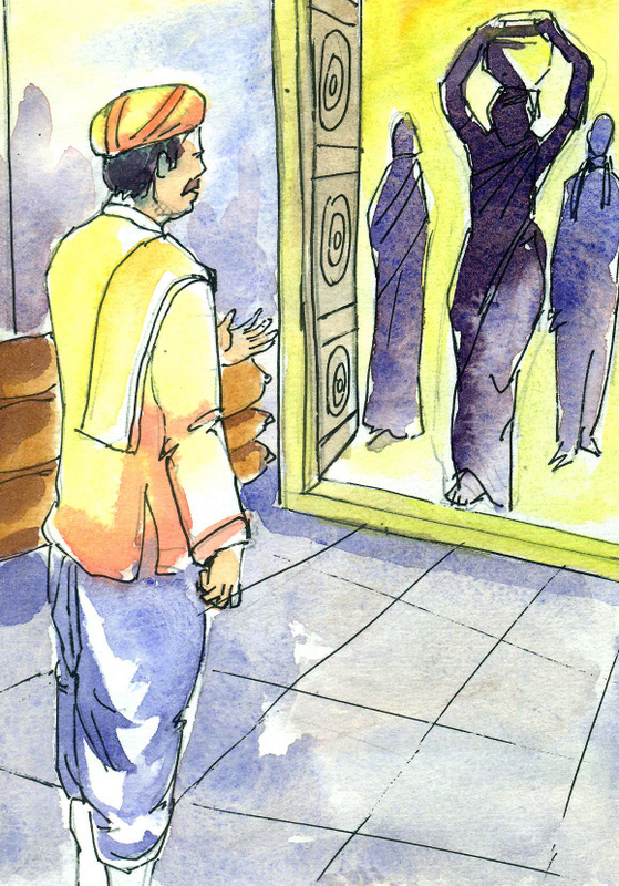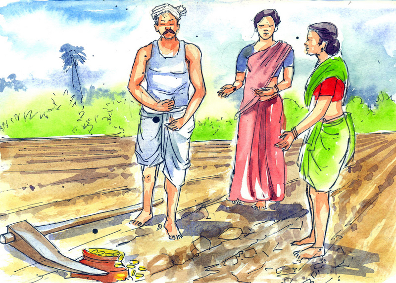 "అవును. మనది కాని సొత్తుని మనం తీసుకోకూడదు. ఈ బిందెను నా తలపైకి ఎత్తు- తీసుకెళ్ళి భూస్వామికి ఇచ్చి వద్దాం" అన్నది రైతు భార్య.