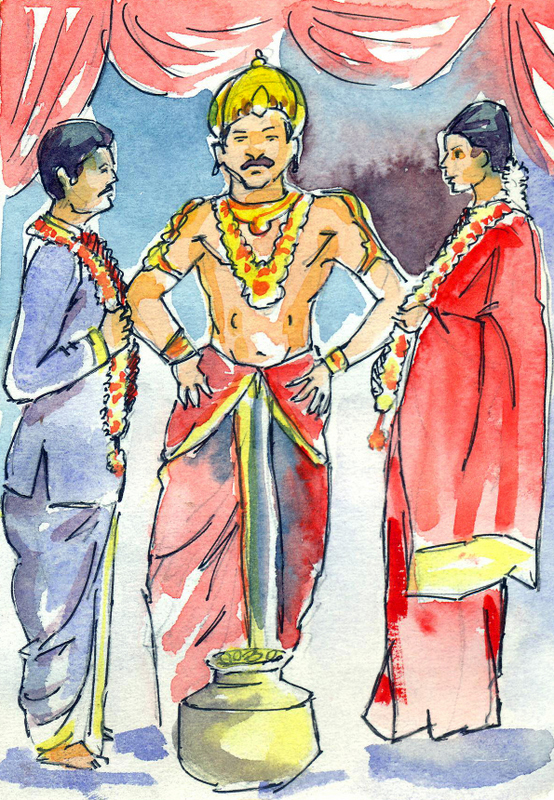 "సరే! అయితే నా తీర్పు వినండి. రైతు కుమార్తెను భూస్వామి కుమారుడు వివాహమాడాలి. బంగారు నాణాలతో నిండిఉన్న ఈ రాగి బిందె, మీ వివాహ సందర్భంగా మీ తల్లిదండ్రులు మీకిస్తున్న బహుమతి అవుతుంది" అన్నాడు ధర్మరాజు. రాజుగారి తీర్పుకు అందరూ సంతోషించారు.