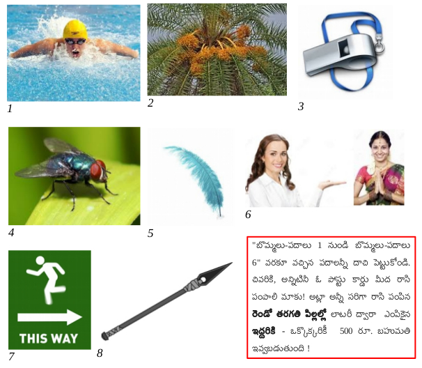 రెండో తరగతి పిల్లలకు ప్రత్యేకం : ఇక్కడ ఎనిమిది బొమ్మలున్నై. ఒక్కో బొమ్మనుండీ రెండు-లేక-మూడు అక్షరాల పదాలు తయారవుతాయి- చూడండి. వింత ఏంటంటే ఆ ఎనిమిది పదాలూ 'ఈ ' తోటే మొదలౌతున్నై! బొమ్మల్ని చూసి పదాలు కనుక్కోండి మరి !