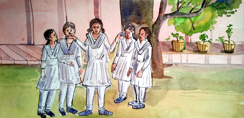 గీత, రమ్య, జ్యోతి ఒకరి మొఖాలు ఒకరు చూసుకొని గట్టిగా నవ్వారు. "బలే ఉన్నావు తల్లీ! అంత పెద్ద పెద్ద మాటలు అవసరమా? పద- బడికి టైమైపోతుంది" అని లతని ఉత్సాహపరచారు. నలుగురూ ముందుకు సాగారు.