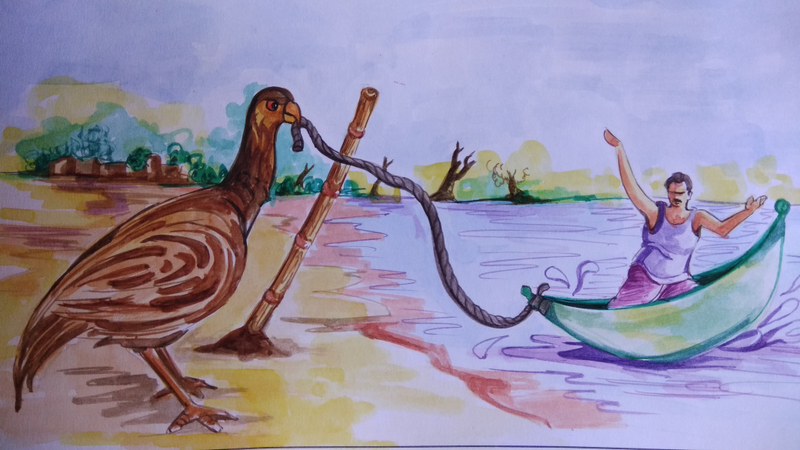 అయితే భైరవ డేగ ఈ ఆశబోతుతో ఇంక బేరం చేయదల్చుకోలేదు. చటుక్కున ఆకాశానికి ఎగిరిందది. వేగంగా వచ్చి, అతను నది ఒడ్డున నేలలో నాటిన కర్రను తన కాళ్ళతో లాగి పారేసింది! తాడు సాయం లేని పడవ పట్టు తప్పింది. సుడిగుండంలో చిక్కుకొని గిరగిరా తిరగటం మొదలెట్టింది.