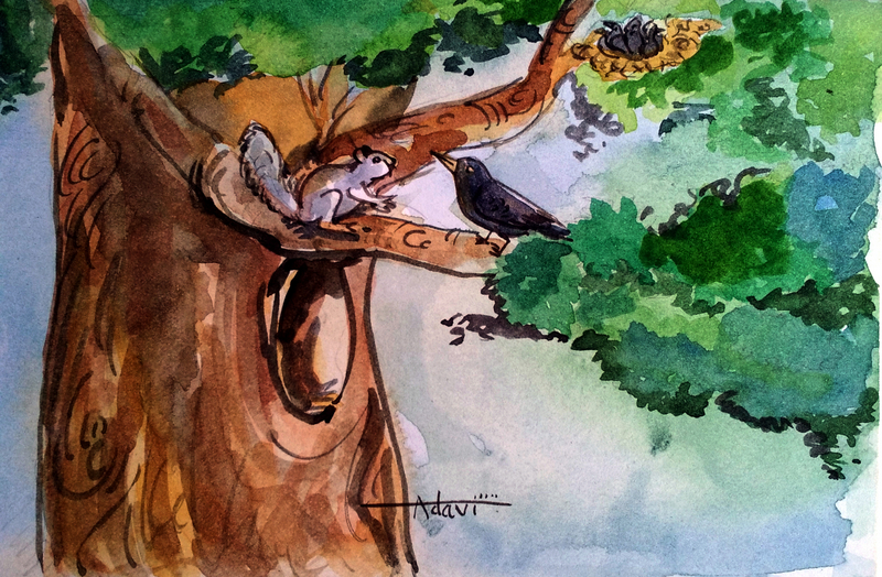 ఉడత మటుకు అక్కడికి దగ్గర్లోనే తిరుగుతూ ఉండేది రోజంతా. సాయంత్రం కాగానే ఓమాటు కాకినీ, పిల్లల్నీ పలకరించి, తన తొర్రలో దూరేది.