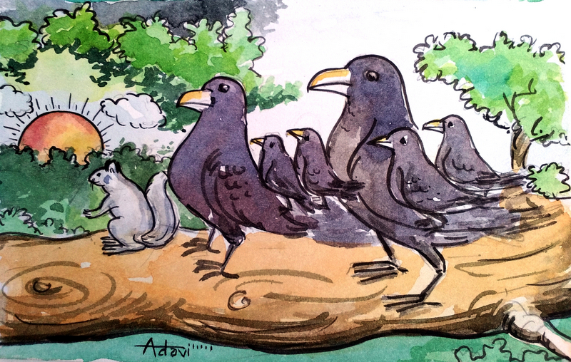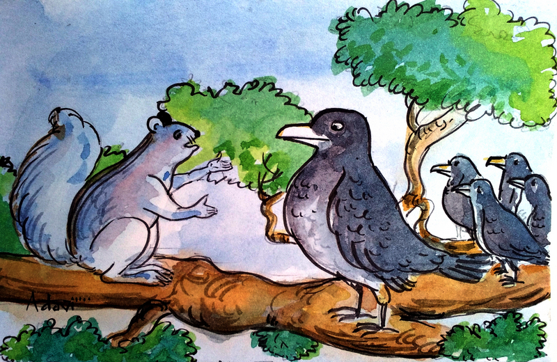 కాకీ, ఉడతా రెండూ "వదినా-వదినా" అనుకుంటూ చాలా సన్నిహితంగా ఉండేవి. తల్లి కాకి రోజూ ఊళ్ళోకి వెళ్ళి ఆహారం కోసం వెతికేది. దొరికిన ఆహారాన్ని ముందుగా పిల్లలకు తెచ్చి పెట్టేది. అంతా అయినాక మళ్ళీ వెళ్ళి, తను కడుపు నింపుకొని వచ్చేది.