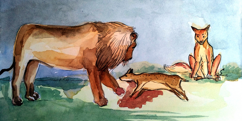 ఆ రోజు సాయంత్రం సమయంలో అవి రెండూ సింహం గుహకి దగ్గర్లో మాటు వేసాయి. అంతలోకే నక్క సరదాగా కబుర్లు చెప్పుకుంటూ ఒక జంతువును వెంట తీసుకురావడం, గుహ బయట నిలబడి 'రాజా' అని పిలవటం, క్షణాల్లో సింహం బయటికి దూకి ఆ జంతువును చంపి, గుహలోకి ఈడ్చుకెళ్ళటం మొత్తం చూసాయి.