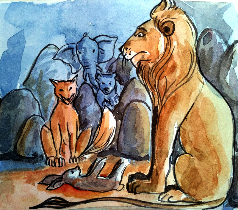 "కానీ, ప్రభూ! మీరు, శాకాహారం.." అని గొణిగిన నక్క, దాని కేసి చూస్తూనే మాట మార్చి, "సరే ప్రభూ! తమరు ఎట్లా అంటే అట్లా చేద్దాం. ఏదైనా జంతువును పిల్చుకొచ్చి, ఆనక మిమ్మల్ని కలుస్తాను" అంటూ బయటికి పోయింది.
