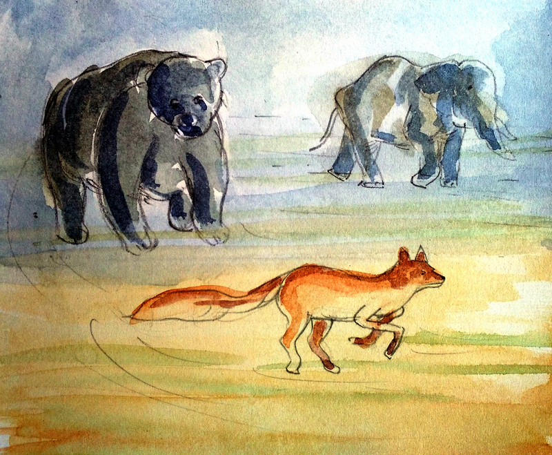 మరుసటి రోజు సాయంత్రం అవి గుహ వైపుకు పోతుంటే, దూరంగా నక్క ఉషారుగా ఈల వేసుకుంటూ రావటం కనిపించింది. దాన్ని చూడగానే ఏనుగు కనుసైగ చేసి, తను ఓ చెట్టు ప్రక్కకు పోయి గడ్డి మేస్తున్నట్లు నటించటం మొదలు పెట్టింది. ఎలుగుబంటి తను ఒక్కతే వచ్చినట్లు, రోడ్డు వెంబడి ముందుకు సాగింది.