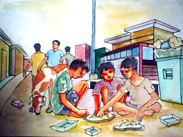 కూల్డ్రింక్ చేతిలో పట్టుకొని నడుస్తూ ఆ "గార్డెన్" వెనకవైపుకెళ్ళాను. అక్కడ పిల్లలు ఎవరో కొట్లాడుతున్నట్లున్నారు- ఏంటా అని అటువైపుకెళ్ళా- వాంతికొచ్చినట్లయింది. అక్కడ ఓ పదిమంది పిల్లలు- మేం తిని పారేసిన అన్నాన్నీ, చీకి పడేసిన ఎముకల్నీ ఏరుకుని తింటున్నారు. వాటికోసం కొట్లాడుకుంటున్నారు. వాళ్ళు తింటున్న ఆ ఆహారాన్నీ, వాళ్ళున్న ఆ ప్రదేశాన్నీ చూస్తే నా ఒళ్ళు జలదరించింది. వాళ్ల చుట్టూతా పందులు,కుక్కలు- అన్నీ అక్కడికి విసిరి పడేస్తున్న విస్తర్ల కోసం వాళ్లతో బాటు ఎగబడుతున్నాయి. ఆ పిల్లలకు పోటీగా దొరికిన దాన్ని దొరికినట్లు ఆబగా తింటున్నాయి.