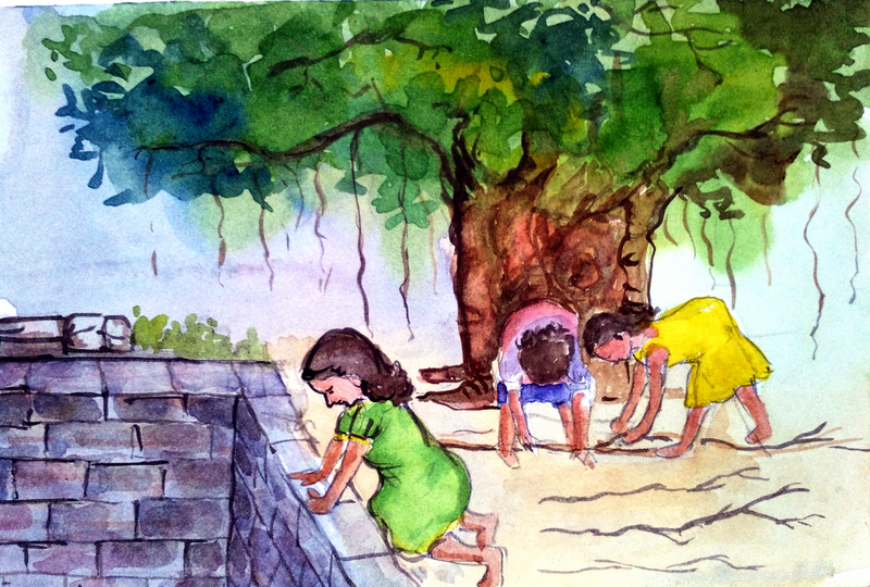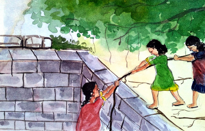 పిల్లలంతా గొల్లుమన్నారు. ఏం చేయాలో ఎవరికీ పాలుపోలేదు. సమయస్ఫూర్తిగల సరళ అటు-ఇటు చూసింది. దగ్గర్లోనే మఱ్రి చెట్టు ఒకటి కనబడింది. "మర్రి ఊడలు తీసుకురండి!" అని అరిచింది. పిల్లలంతా ఊడలు తెంపుకొని వచ్చారు. "నీకేమీ కాదు వసంతా! ఈత కొడుతూ నీళ్ళమీద తేలుతూ ఉండు అంతే" అని వసంతకు ధైర్యం చెప్పి, "ఆ ఊడల్ని ఒక దానితో ఒకటి మెలి పెట్టి, తాడులాగా పేనండి!" అని పిల్లల్ని ఆదేశించింది సరళ. చూస్తూండగానే మెలిపెట్టిన ఊడలు పెద్ద మోకులాగా అయినాయి. ఆ మోకును పట్టుకొని అందరూ కలిసి బావిలోకి వదిలారు. సరళ దాన్ని పట్టుకోగానే అందరూ కలిసి ఆమెను బయటికి లాగారు.