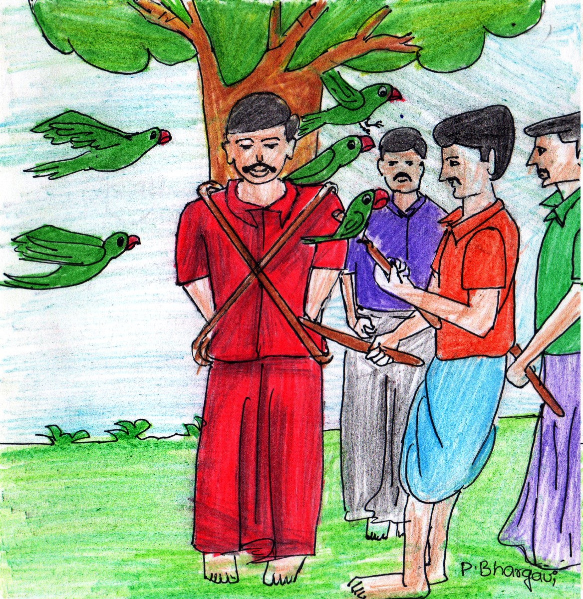 చిలకల గుంపు వచ్చి తన్నులు తింటున్న చిన్నయ్య ముందు వాలింది. రామ చిలుక వెళ్ళి గురువుకు అడ్డం పడుతూ "పాపం, ఈయన్ని ఏమీ అనకండి.