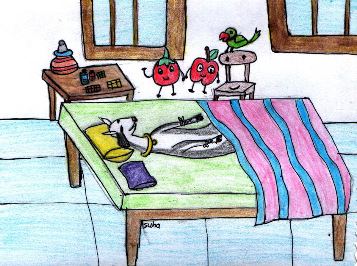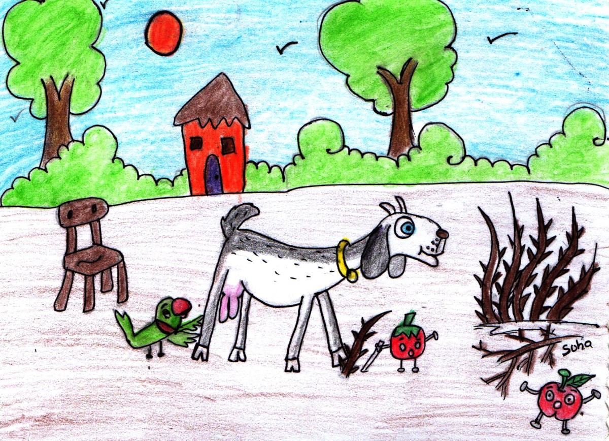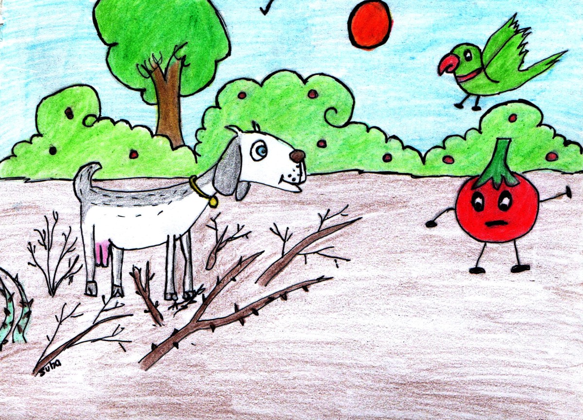 "పాపం, ఈ మేకను చూడు- దాని కాలు ముళ్ళలో ఇరుక్కుపోయింది. దానికి చాలా నొప్పి పుడుతున్నది. ఎలాగైనా దాన్ని ఈ ముళ్ళ బారినుండి తప్పించాలని ప్రయత్నిస్తూన్నాం" అన్నాయి చిలుక, టమాటా.