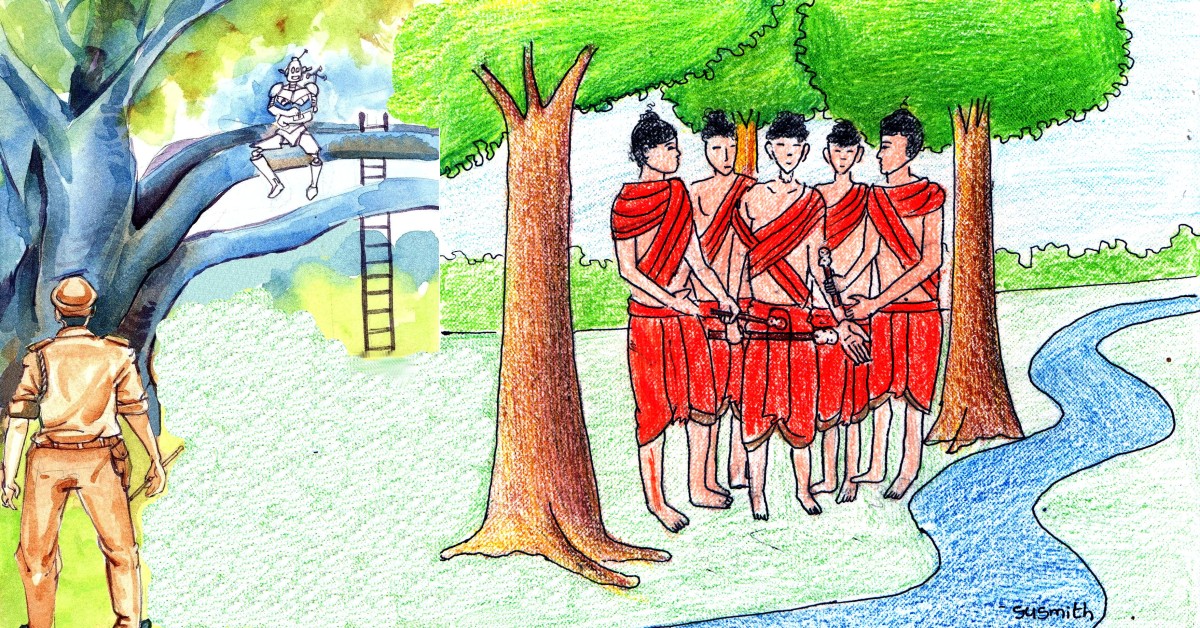 ఐదో వాడు మంత్రాలు చదివేటప్పటికి నదికి అవతల అడవిలో ఉన్న చెట్లు ఒక వంద, అక్కడికి వచ్చి చేరుకున్నాయి. ఆ చెట్లతో వంతెన కట్టి, కులాసాగా నడచుకొంటూ నదిని దాటాడు అతను!