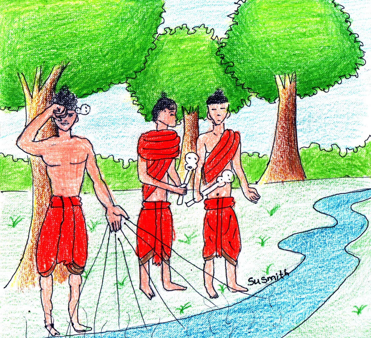 మూడవవాడు తన తుండుగుడ్డనొకదాన్ని తీసి ముందు పెట్టుకున్నాడు. ఏవో మంత్రాలు చదివాక, దాన్ని నడుముకు కట్టుకున్నాడు. ఆ వెంటనే గాలిలోకి లేచి, అలవోకగా నదిని దాటేసాడు!