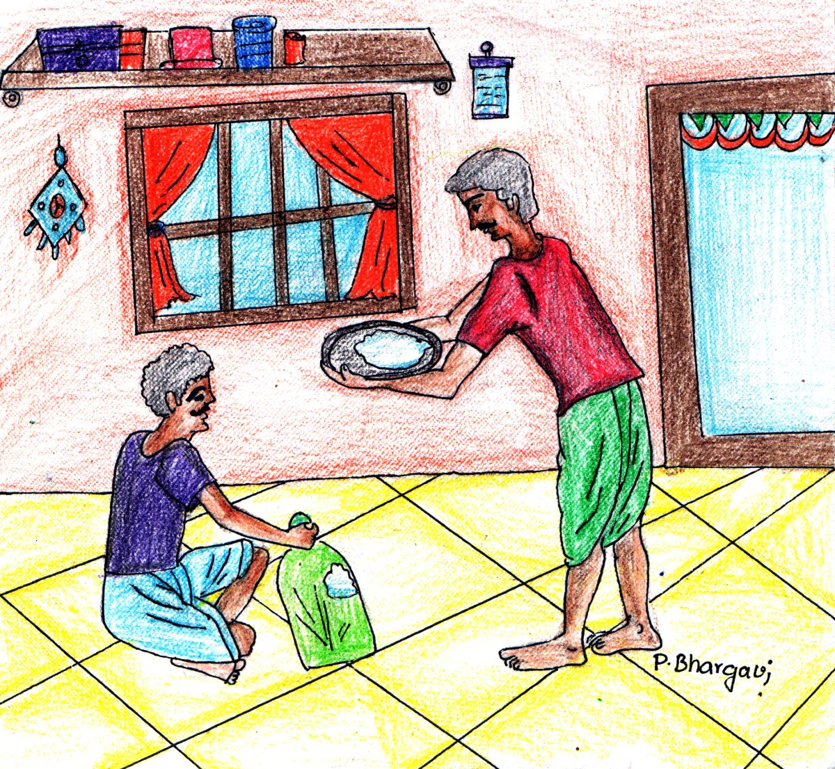 కంచం అంచు వెంబడి మెతుకులు క్రింద పడకుండా ఉండాలని, తను ఎప్పుడు అన్నం తిన్నా, కంచం మధ్యలోనే కలుపుకొని తినటం అలవరచుకున్నాడు.