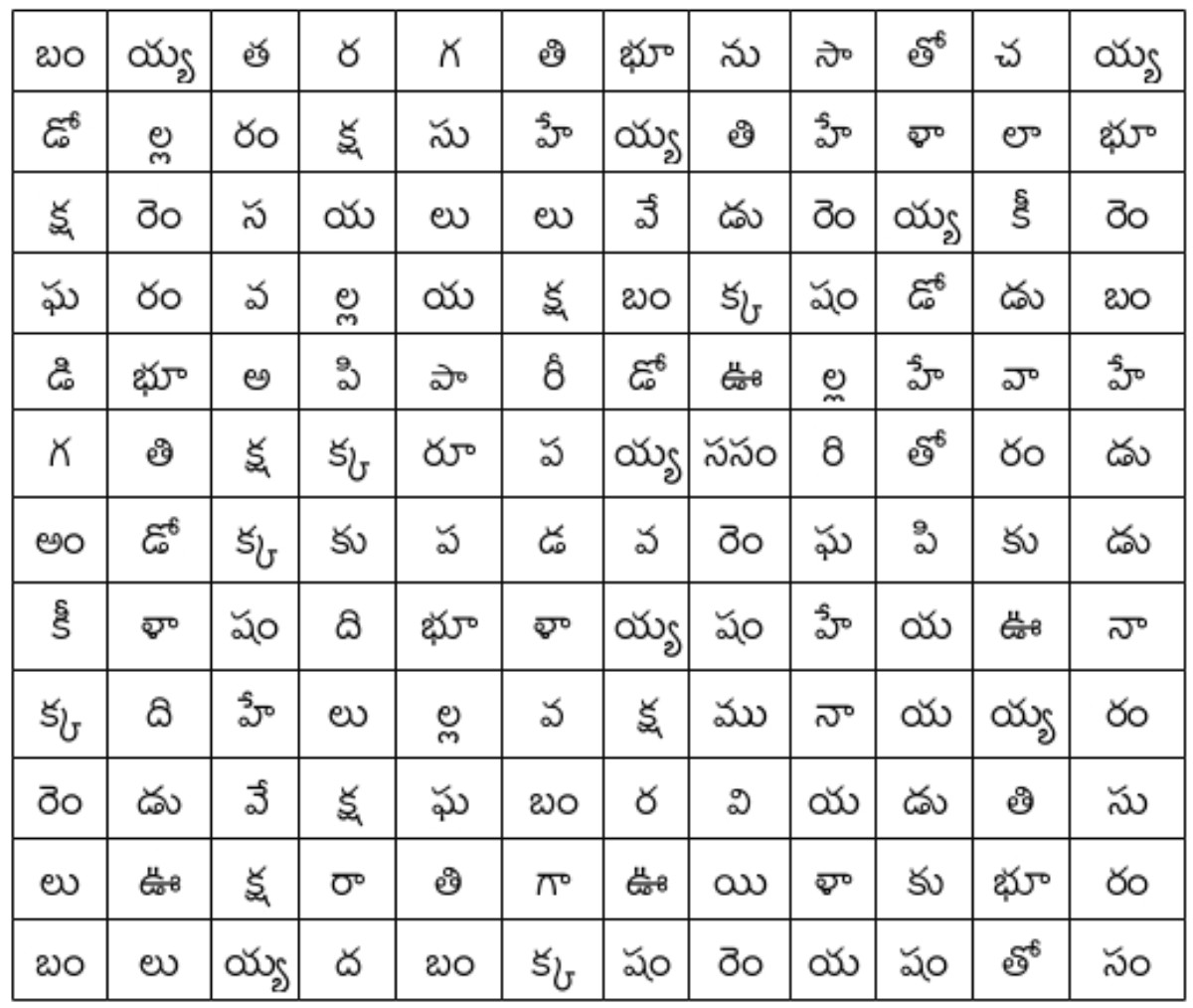 పడవ, బంగారము, తరగతి, చలాకీ, కుక్క పిల్ల, వినాయకుడు, దయ్యాలు, వయసు, పరీక్షలు, రూపాయలు, రాఘవయ్య, కుళాయి, అంగడి, ఊపిరి, సంతోషం, సానుభూతి, పదిహేడు, రెండువేలు, రెండోవాడు, అవసరం :- ఈ పదాలన్నీ క్రింది పట్టికలో దాగున్నాయి-నిలువుగా, అడ్డంగా, వాలుగా, క్రింది నుండి పైకి -ఎటుపడితే అటు! వాటిని వెతికి వాటి చుట్టూ గుండ్రాలు గీయండి!