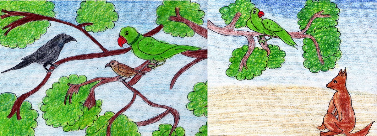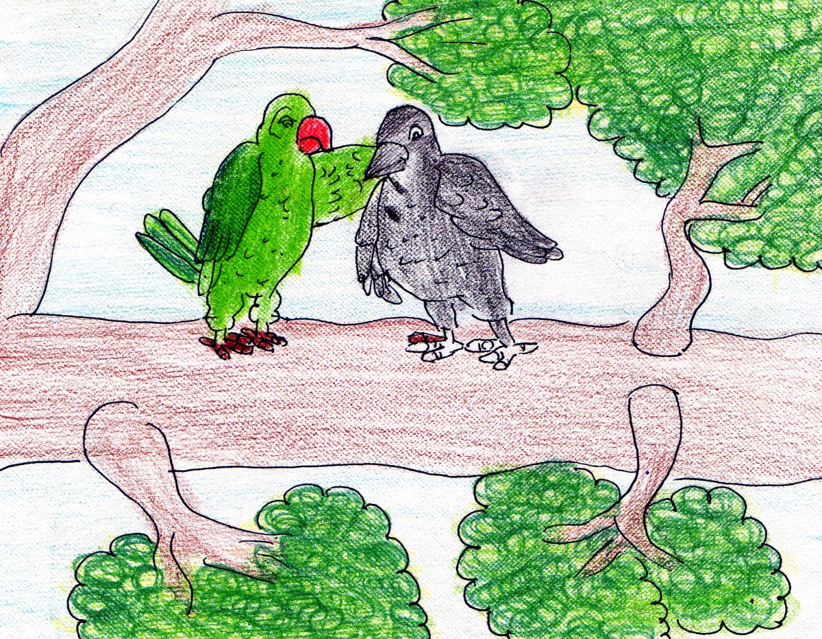 అనగనగా ఒక అడవిలో ఒక కాకి, పిచ్చుక, చిలుక ఉండేవి. కాకి, పిచ్చుక చాలా మంచి స్నేహితులు- కానీ చిలుక మాత్రం కాకిని చూసి ఊరికే అసహ్యించుకుంటూ ఉండేది.