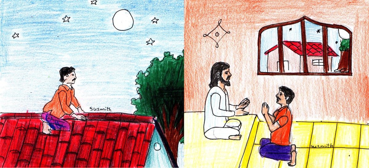 అనుకోకుండా వాడి కాలు జారింది! దొర్లుకుంటూ పోయి ఒక దేవాలయ ప్రాంగణంలో పడ్డాడు. ఆ పడటంలో వాడి కాలు బెణికింది; మోకాళ్లు దోక్కుపోయాయి. అయినా వాడు పడిన చోటు చీకటిగా ఉండటం వల్లనో ఏమో, ఎవరూ వాడిని గమనించలేదు.
