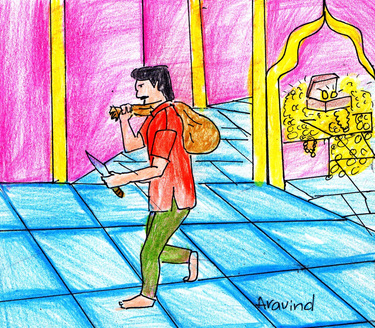 తరువాత కొద్ది రోజులకే వాడు రాజుగారి ఖజానాకు కన్నం వేసాడు! ఖజానా నిండుగా బంగారు నాణాలు, నగలు కుప్పలు కుప్పలుగా పడి ఉన్నాయి. ఎక్కడా ఎలాంటి అలికిడీ లేదు.