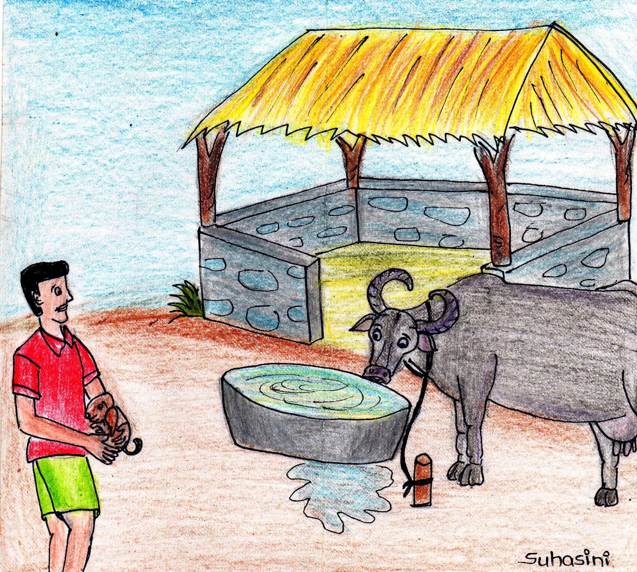 బిట్టు సంతోషానికి అంతులేదు. ఒక చేత్తో రెయిన్బో గాణ్ణి పట్టుకుని గేదె వైపు ఆసక్తిగా చూస్తూ నిలబడ్డాడు.