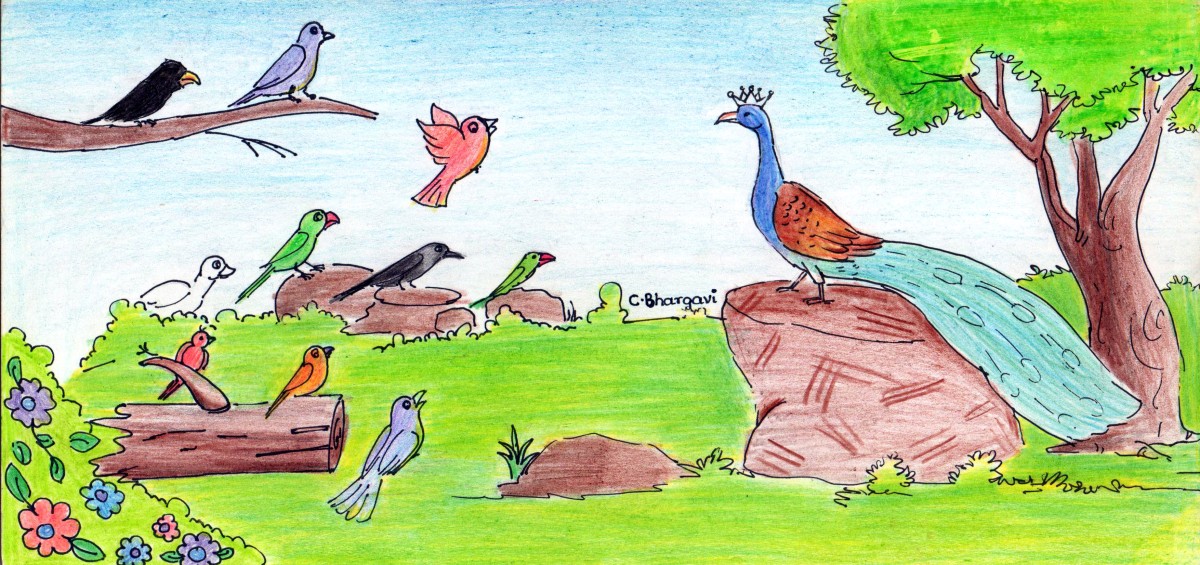 అనగనగా ఒక పక్షి రాజ్యం ఉండేది. ఆ రాజ్యానికి రాజు నెమలి. అప్పట్లో నెమలి ఈకల మీద ఇంత చక్కని కళ్ళు ఉండేవి కావు. అయినా కూడా అది చూసేందుకు బాగానే ఉండేది.