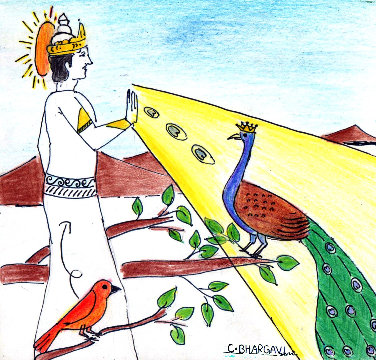 "అన్ని గూళ్ళూ తిరిగేసాను- ఇప్పుడు ఇక మిగిలింది నెమలి ఒక్కటే"అని, సూర్యభగవానుడు నెమలి దగ్గరికి వచ్చాడు.