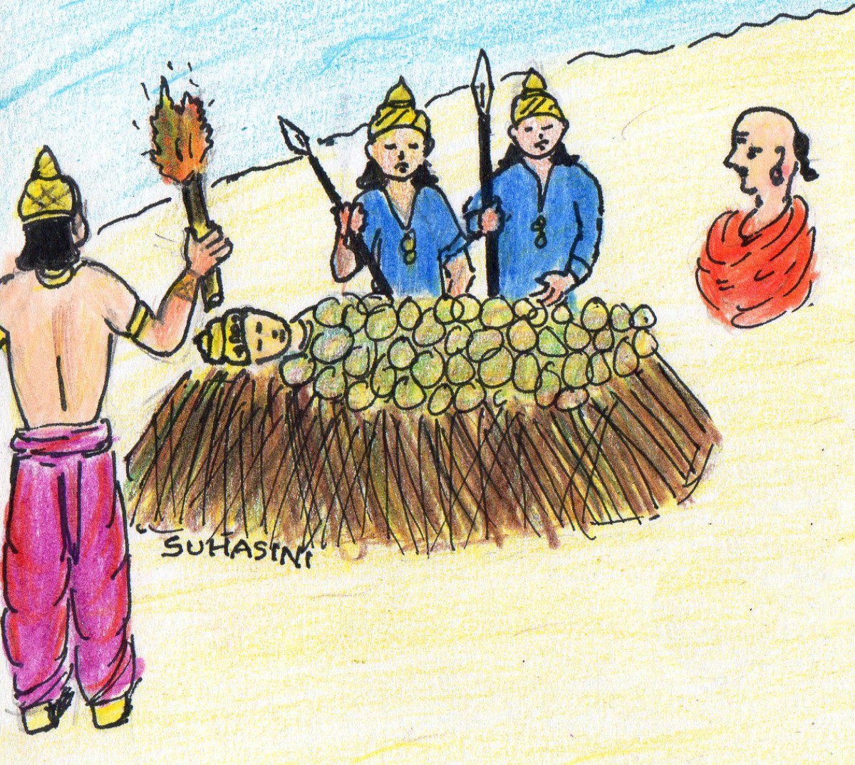 వెంటనే ఆమె తెలివిగా, రాజుగారికి ఏమాత్రం తెలీకుండానే తమ సైనికులను ఆదేశించింది: "మన రాజ్యంలో ఎక్కడా శవం అంటూ లేకుండా చూడండి. జంతువుల శరీరాలు గానీ, మనుషుల శవాలుగానీ, వెతికి వెతికి అన్నిటినీ తక్షణం కాల్చేయండి" అని. "అట్లా కాల్చేస్తే, అమరుకుని దేహంలో ఉన్న సిద్ధపురుషుడి కళేబరం కూడా కాలిపోతుంది కదా, ఇక అతడు శాశ్వతంగా తమతో ఉండిపోతాడు!" అని ఆమె ఆలోచన.