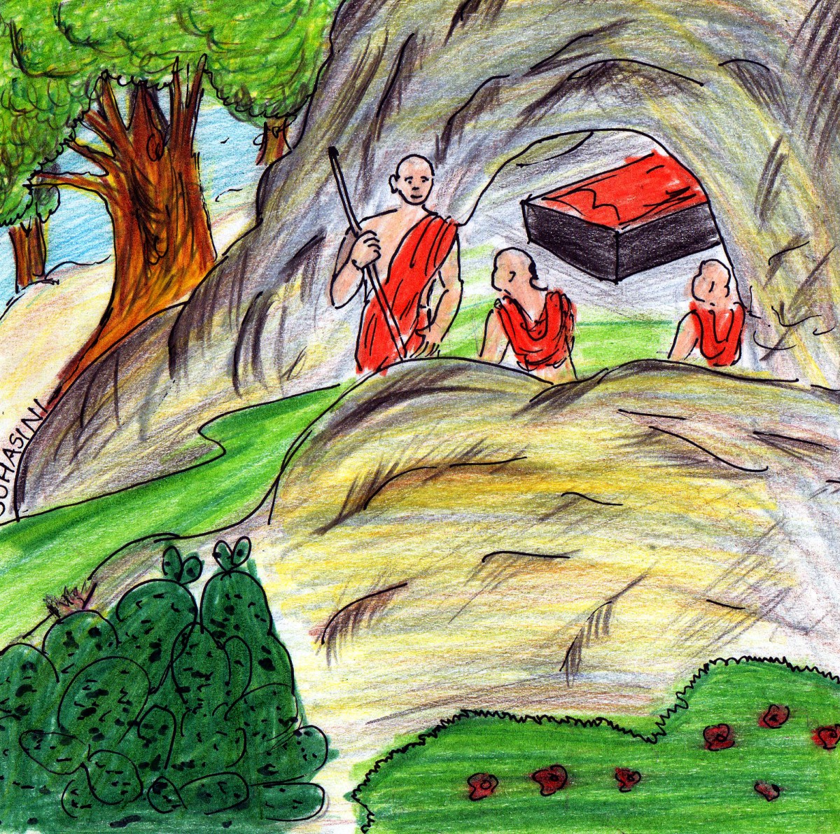 ఇక ఇక్కడ, గుహలో ఉన్న శంకరుడి శిష్యులకు 'గురువుగారి దేహాన్ని కాపాడడం ఇప్పుడింక కష్టం' అని అర్థమవ్వసాగింది. కనిపించిన శవాలనన్నిటినీ కాల్చేస్తున్నారు రాజభటులు. ఏదో ఒక క్షణాన వాళ్ళు గుహ దగ్గరికి రాకపోరు; గురువుగారి శరీరాన్ని కూడా కాల్చేయకపోరు! ఎలాగ ఇప్పుడు?" అని వాళ్ళు కంగారు పడ్డారు.
